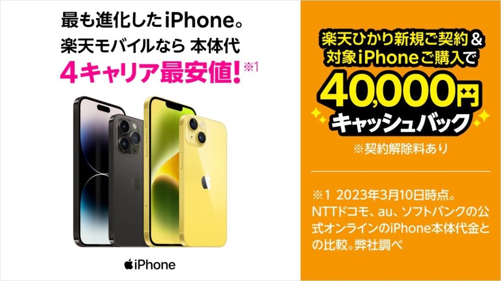 新色イエローを含む対象iPhoneご購入と、楽天ひかり新規ご契約で40,000円キャッシュバックされるキャンペーンがスタートしました。